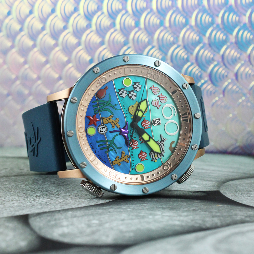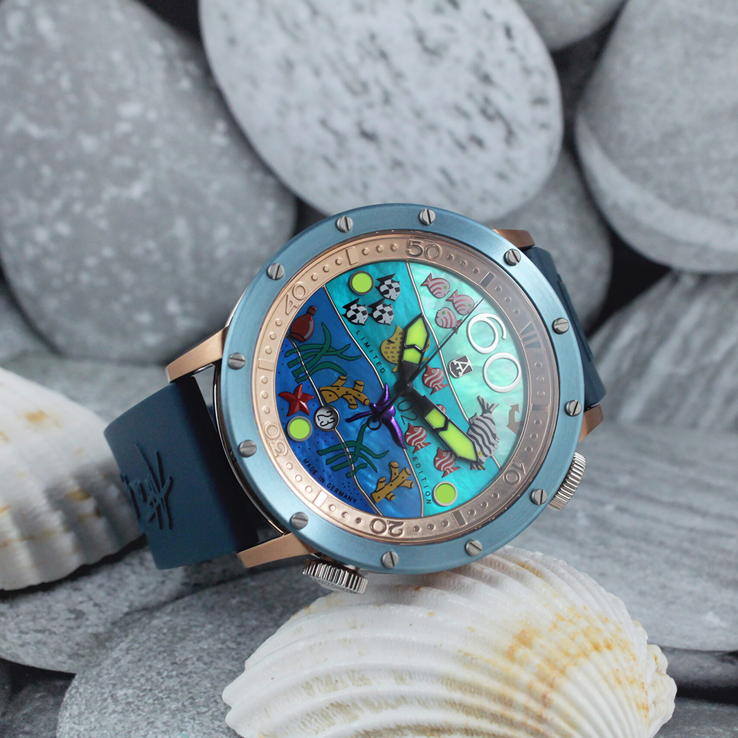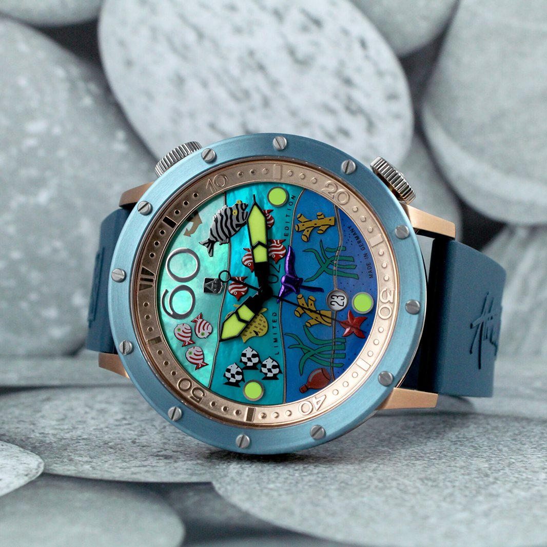 Lined with genuine mother-of-pearl in various colors, with different coloured fish and sea elements as applications in 3D effect, hour markers with orange luminous material; lumed hands; rotating inner bezel