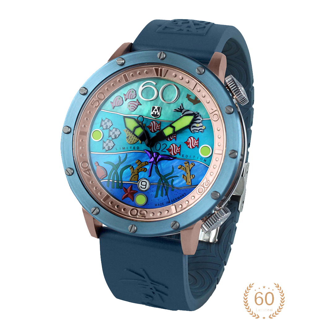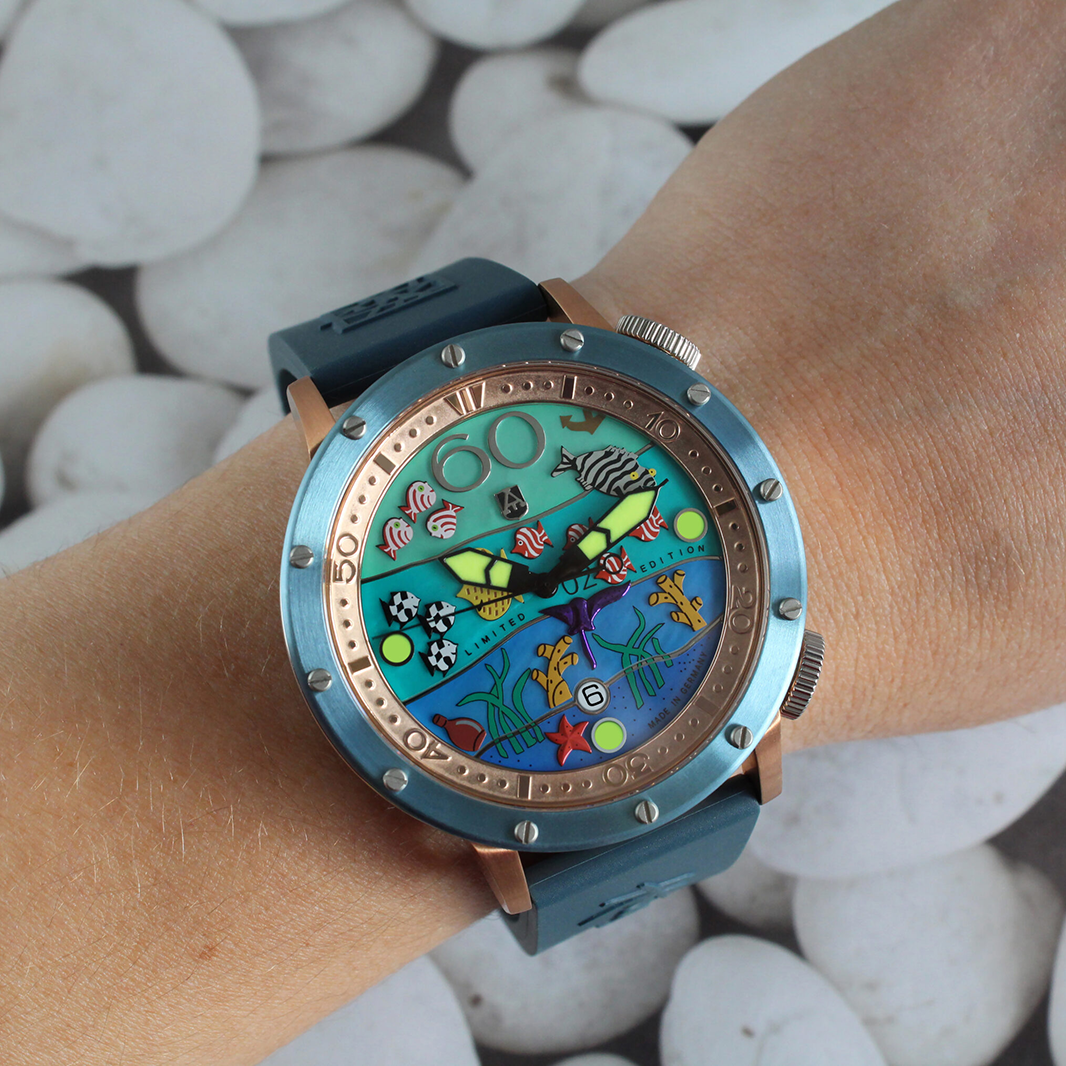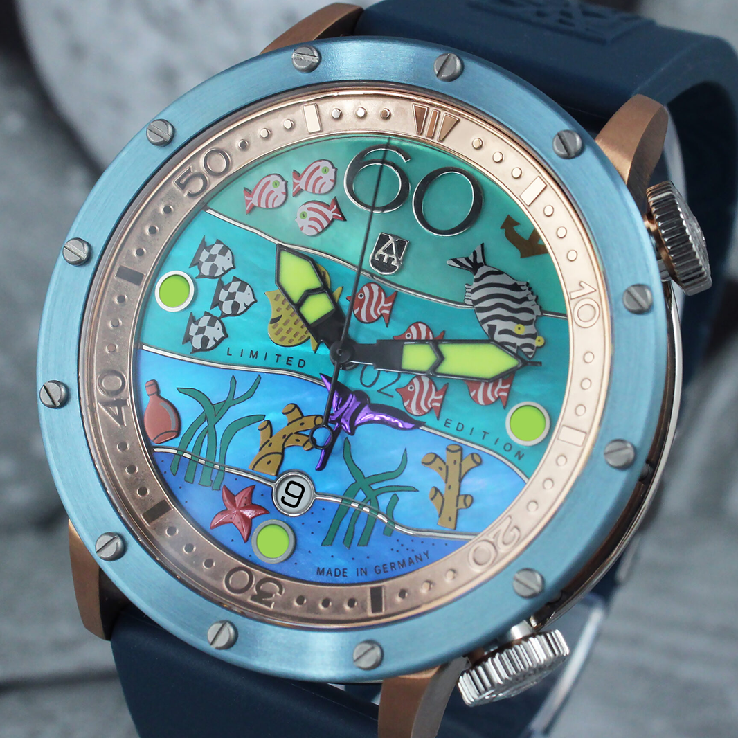 Lined with genuine mother-of-pearl in various colors, with different coloured fish and sea elements as applications in 3D effect, hour markers with orange luminous material; lumed hands; rotating inner bezel