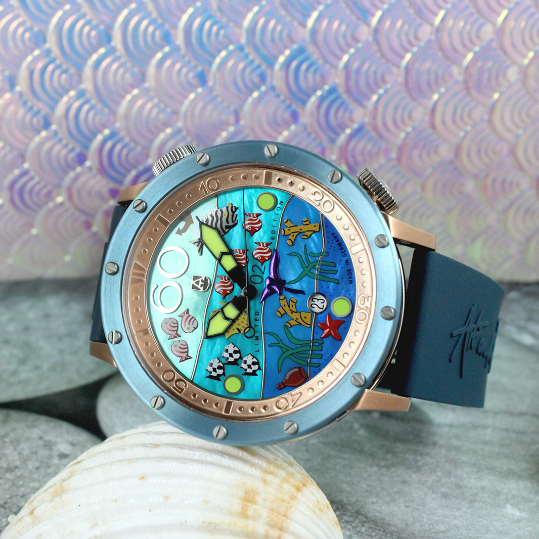 A tribute to the beauty of the sea — the Alexander Shorokhoff Flensi brings an underwater world to life with a 3D mother-of-pearl dial, titanium case, and Swiss automatic movement.