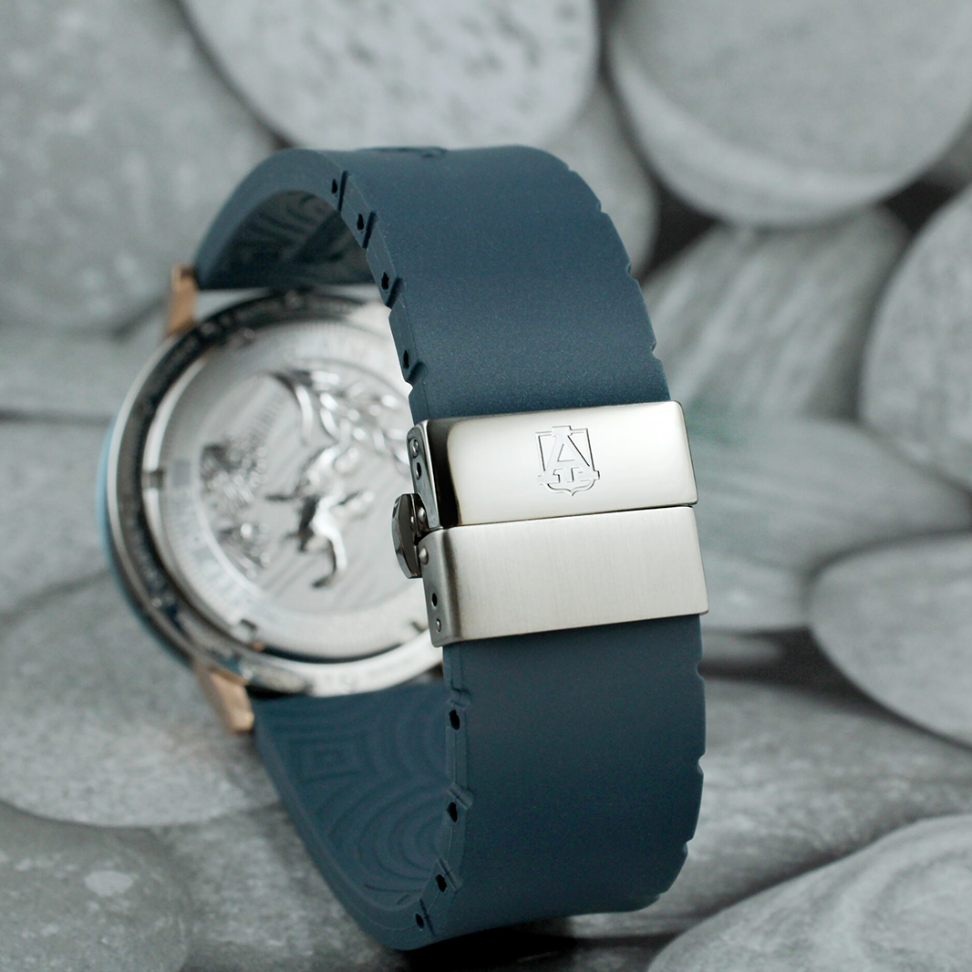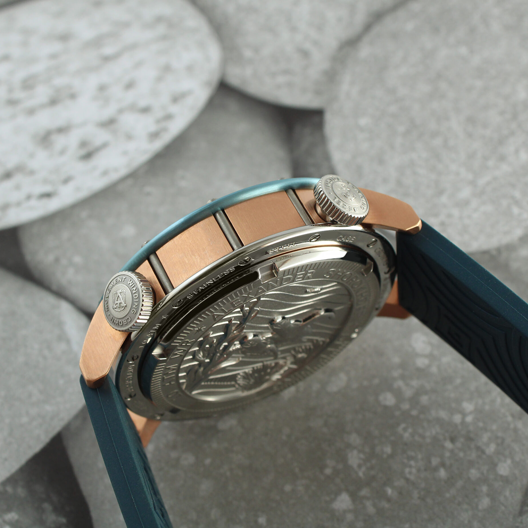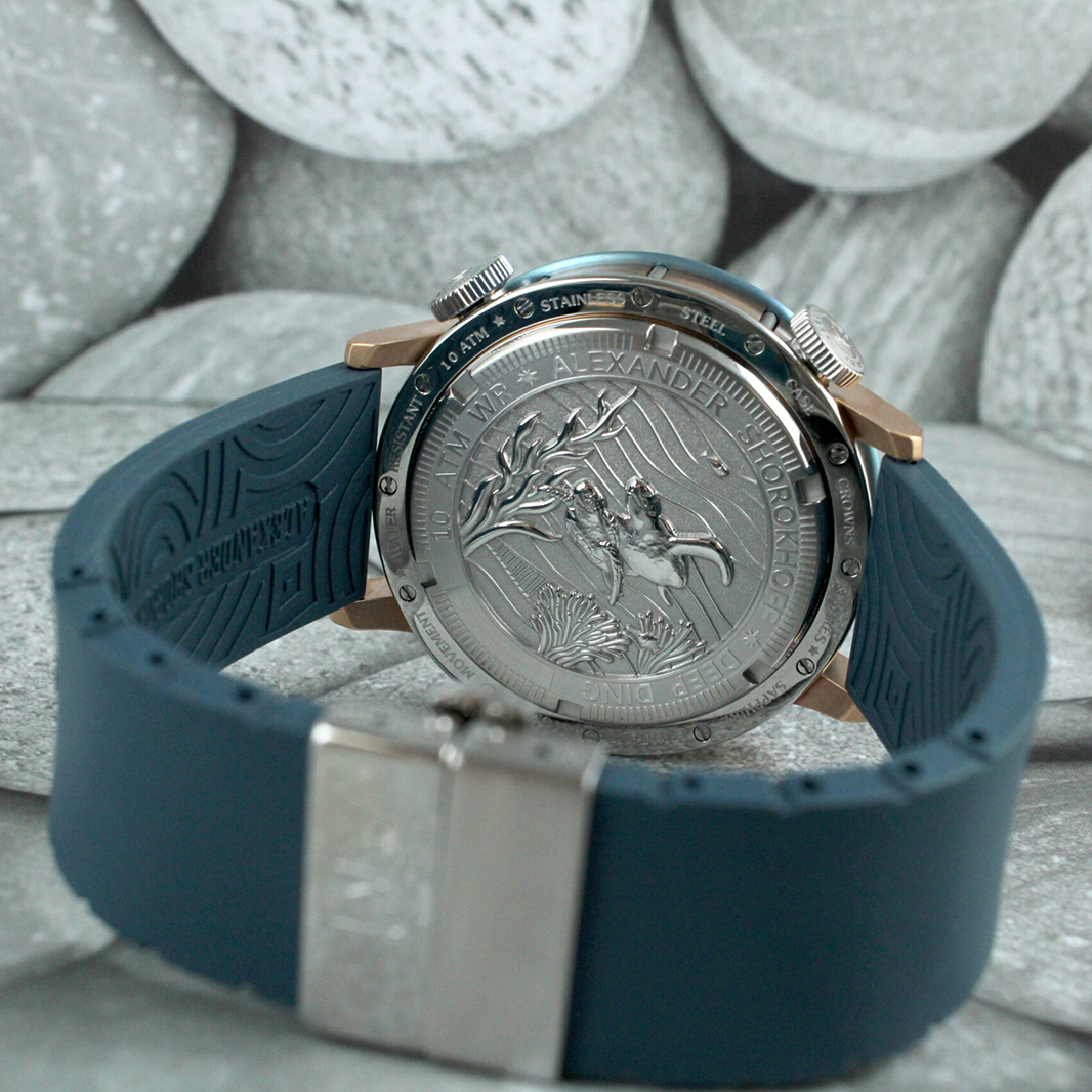 Bold black hands with orange luminous accents ensure excellent legibility against the ocean-inspired dial, while the reverse side continues the theme with a pair of turtles engraved in 3D relief on the case back.