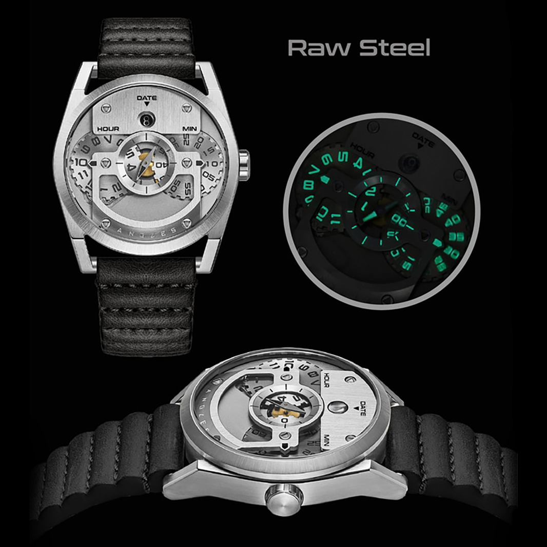 Raw Steel: Brushed steel with black Super-LumiNova® numerals: industrial and honest.