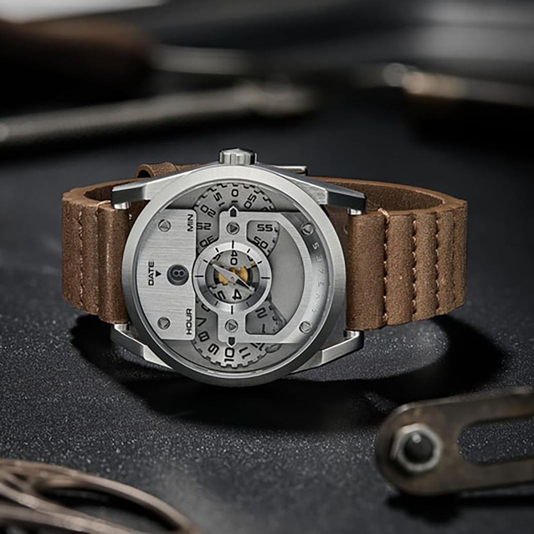 The 22–20mm Italian vegetable-tanned leather strap complements the watch’s clean geometry, hand-sewn and finished with a solid stainless-steel buckle. Comfortable and elegant, it completes the Disc One’s balance of utility and artistry.