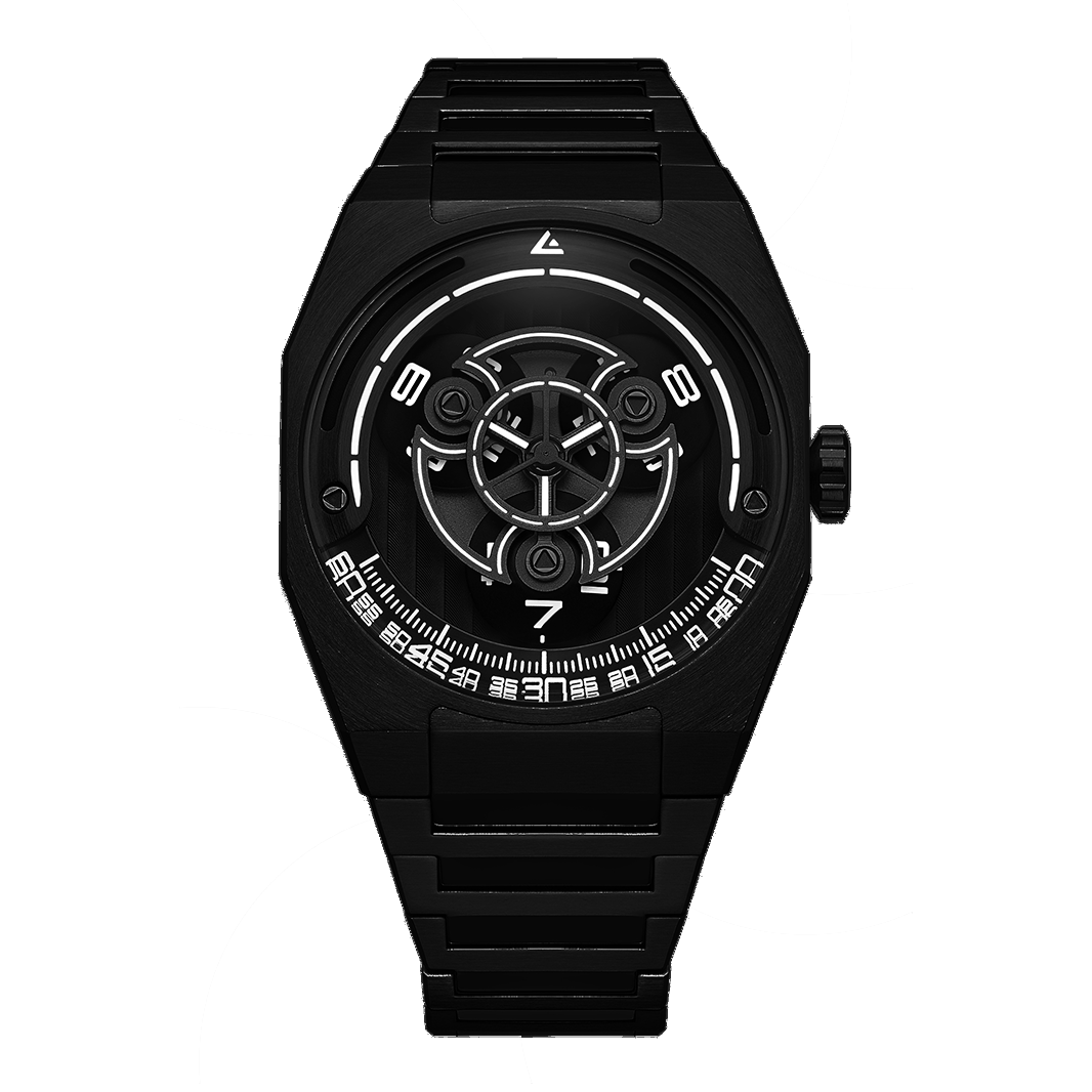Housed in a 41mm stainless-steel case, the KOI-5 pairs industrial strength with refined elegance. The semi-circular minute track, accented by Swiss Super-LumiNova™-coated numerals, glows against a backdrop of mechanical artistry.