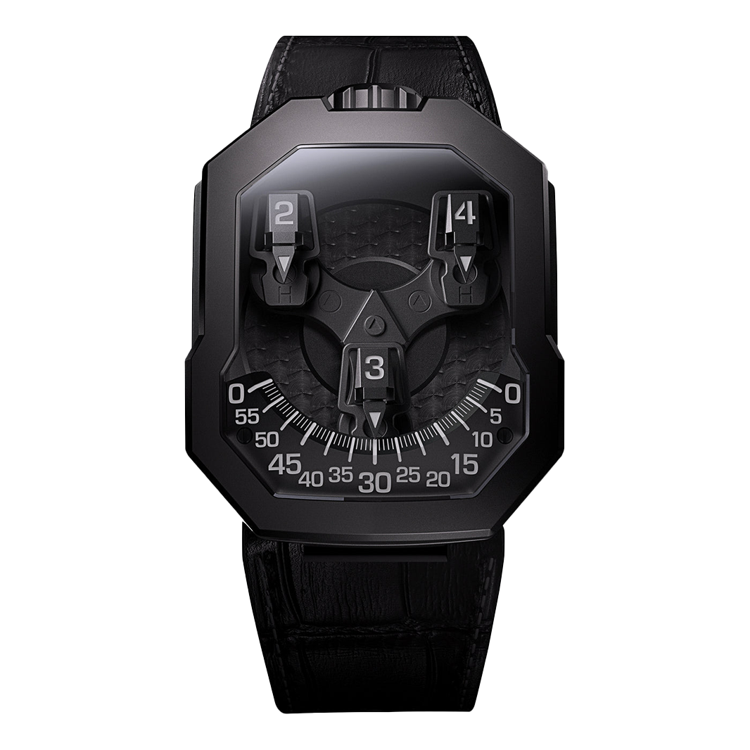 Grade 5 titanium arm, anodized aluminum rotating pyramids, fish scale patterned-dial; SuperLuminova-coated numerals on the semi-circular minute track and rotating pyramids