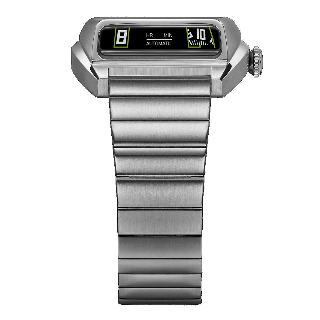 The stainless steel bracelet mirrors the RT0’s industrial-mechanical character with a polished–brushed finish and integrated clasp for a seamless wrist profile. Its solid links ensure both comfort and durability while reinforcing the watch’s bold, utilitarian appeal.