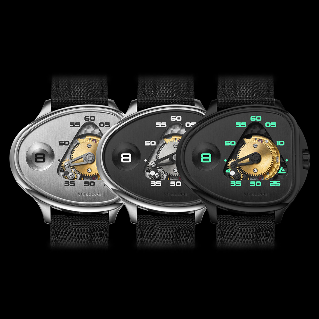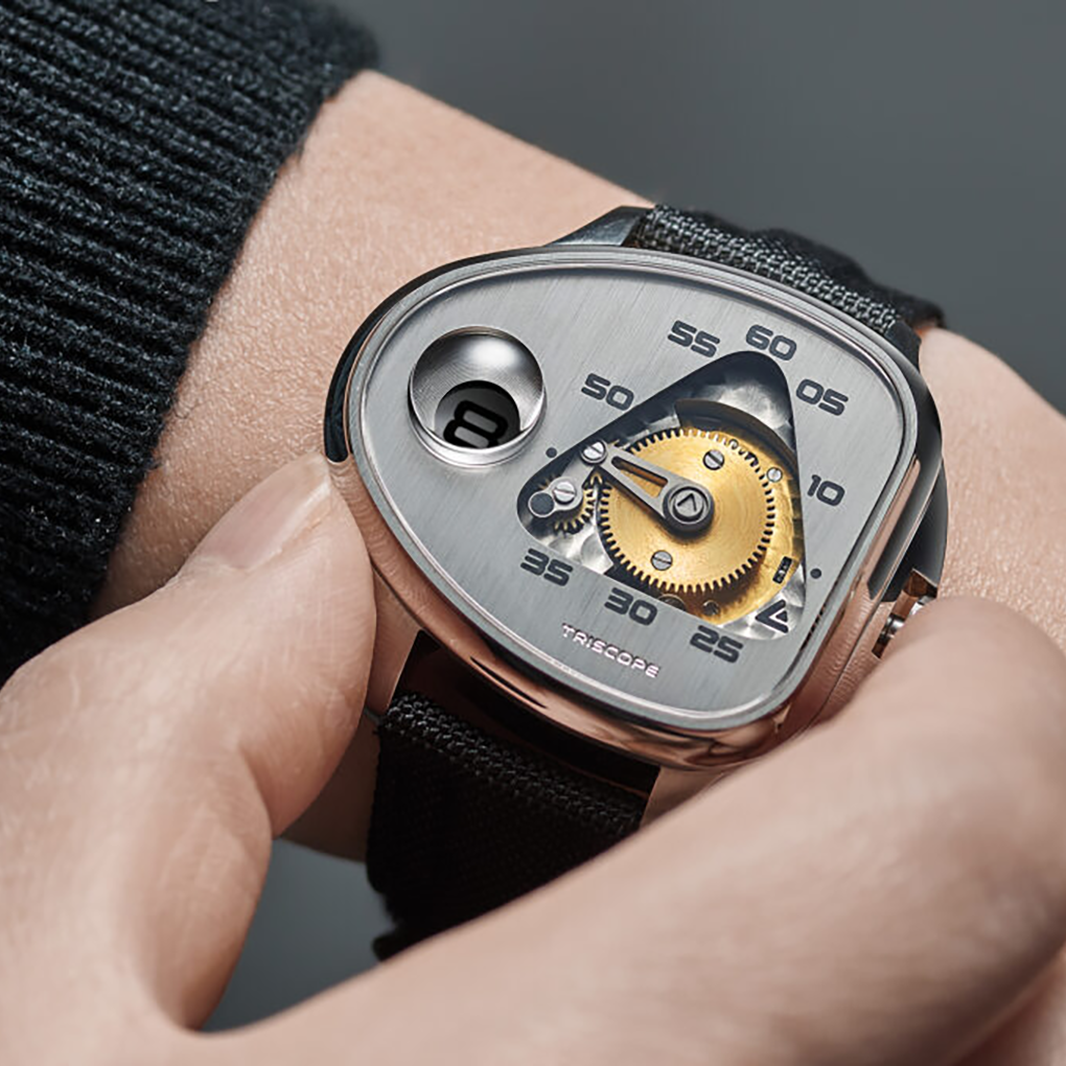 The Angles Triscope challenges the way we perceive time. Instead of a circular dial and sweeping hands, it presents time through geometry: a jumping hour display paired with a triangular minute path, housed within a softened Reuleaux triangle case.