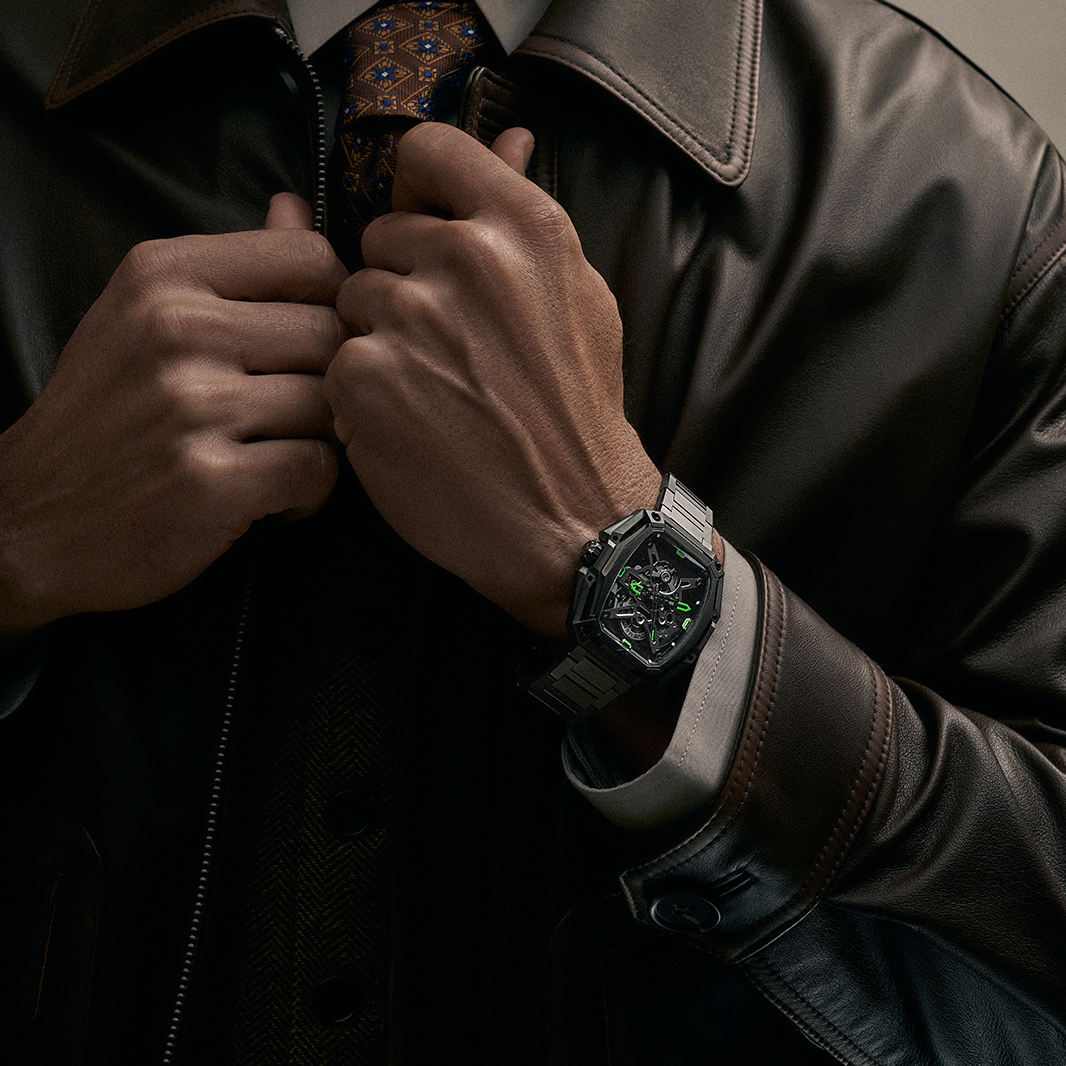 The three-layered 316L stainless steel case, finished with DLC (Diamond-Like Carbon) coating, balances bold angular geometry with sleek contours. Micro-blasted textures and polished chamfers add depth and visual intrigue.