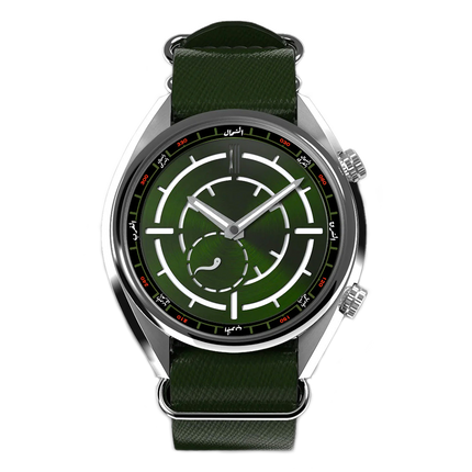 The dial colour sought inspiration from the amalgamated colours of the waters and terrain found in the Khors of the Arabian Peninsula. The limited edition of 35 pieces features a compass bezel denoted entirely in Modern Standard Arabic.