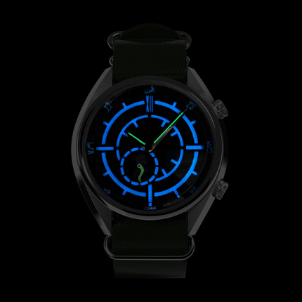 Olive coloured sunburst dial; secondary dial layer with Chrono.AMR blue lume