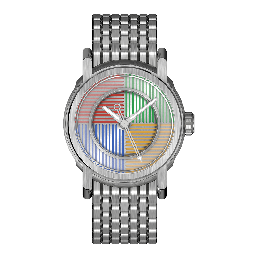 The Horizon Spectrum DotCom is the Spectrum collection at full volume - bright, expressive, and alive with the colours that defined the early internet era. Its multi-layer dial blends vivid red, green, blue and yellow quadrants into a dynamic piece of design architecture that shifts with every angle.