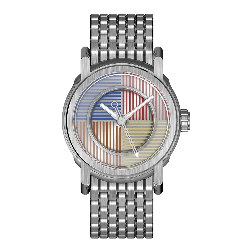 3 distinct layers: top CNC layer; “pizza” segment-a bold, four-section plate individually filled with different colours-adds depth and vibrancy, giving the watch its signature name, Spectrum; outer glass ring |