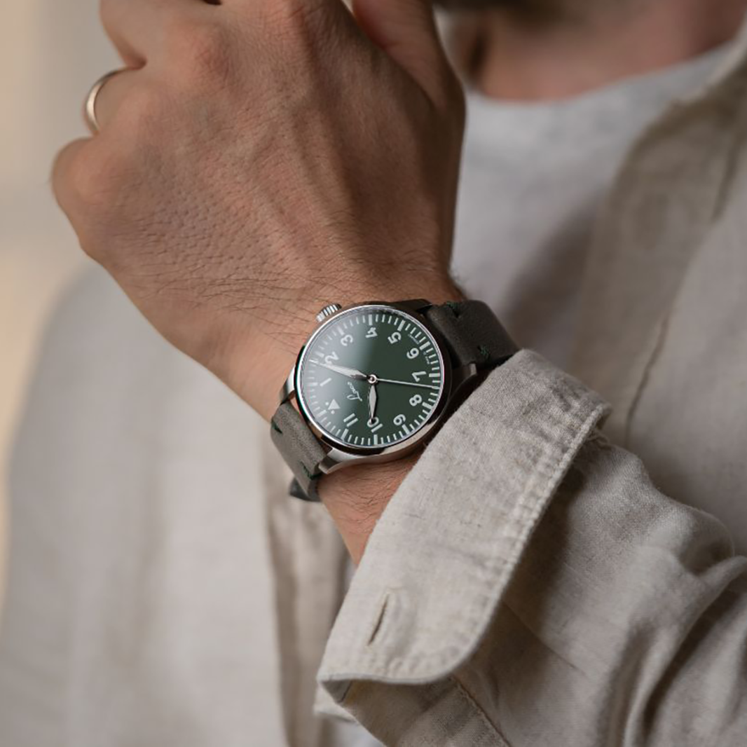 Rooted in Laco’s heritage as one of the original manufacturers of WWII-era pilot watches, the Augsburg Grün 39 captures that utilitarian spirit with a contemporary palette. The green dial offers a subtle point of difference - familiar yet distinctive - paired with crisp white numerals and luminous hands for perfect legibility day or night.