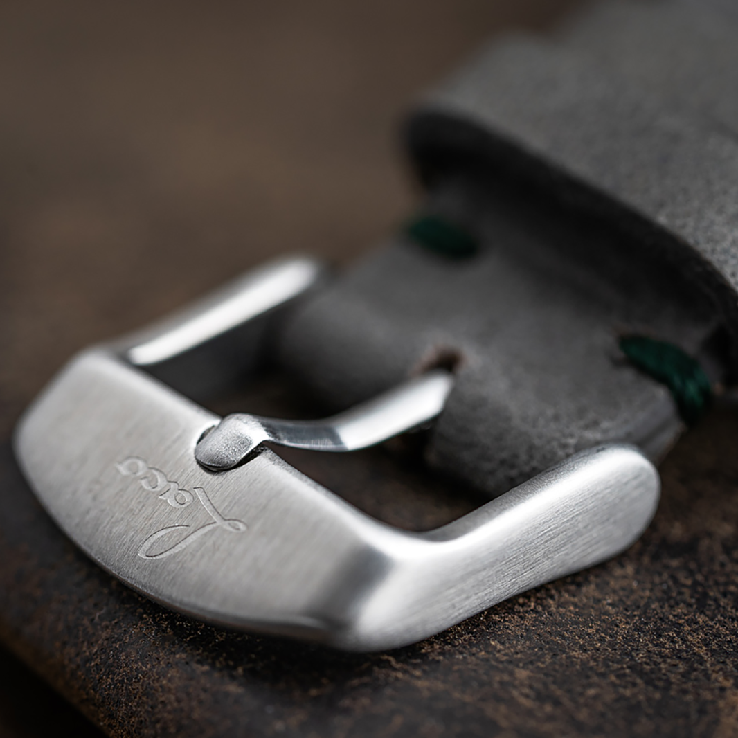 The vintage grey leather strap gives the Laco Augsburg Grün 39 a grounded, rugged character that softens beautifully over time. Contrasting green stitching ties back to the dial tone, enhancing visual cohesion. With its modest dimensions and neutral hues, the watch wears comfortably and pairs easily with any outfit - from aviation jacket to tailored shirt.