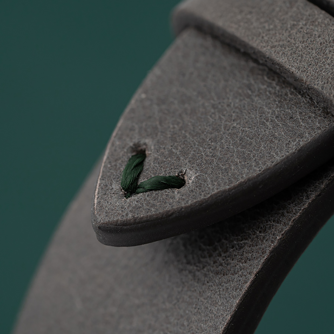 Its brushed stainless-steel case, minimal Type A layout, and domed crystal give the watch an understated authority that suits both casual and formal wear. The grey vintage-style leather strap, accented with green stitching, completes the harmonious look.