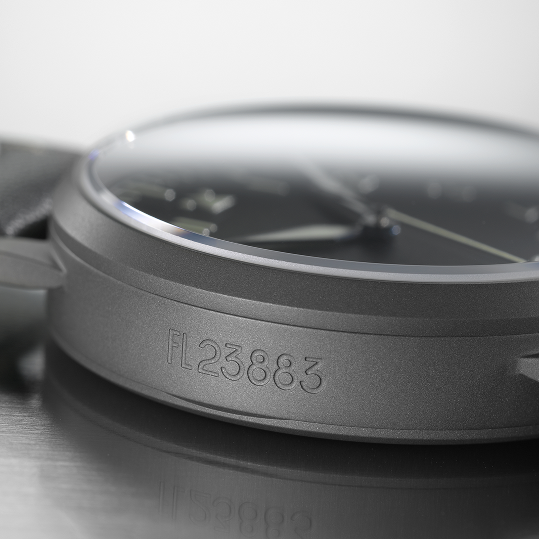 Features “FL 23883” engraving on the side of the case, a nod to its original military classification, and detailed caseback engravings referencing unit, manufacturer, and movement type.