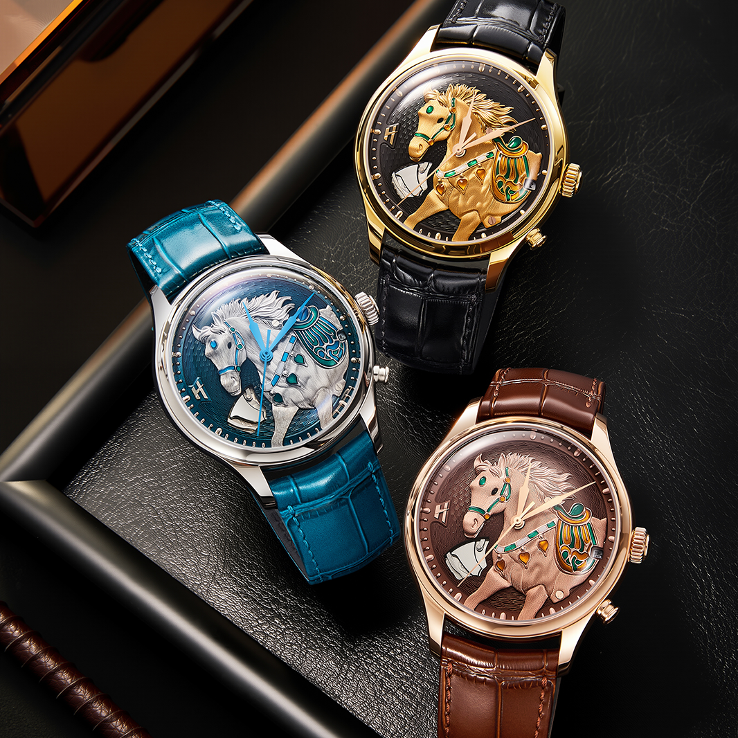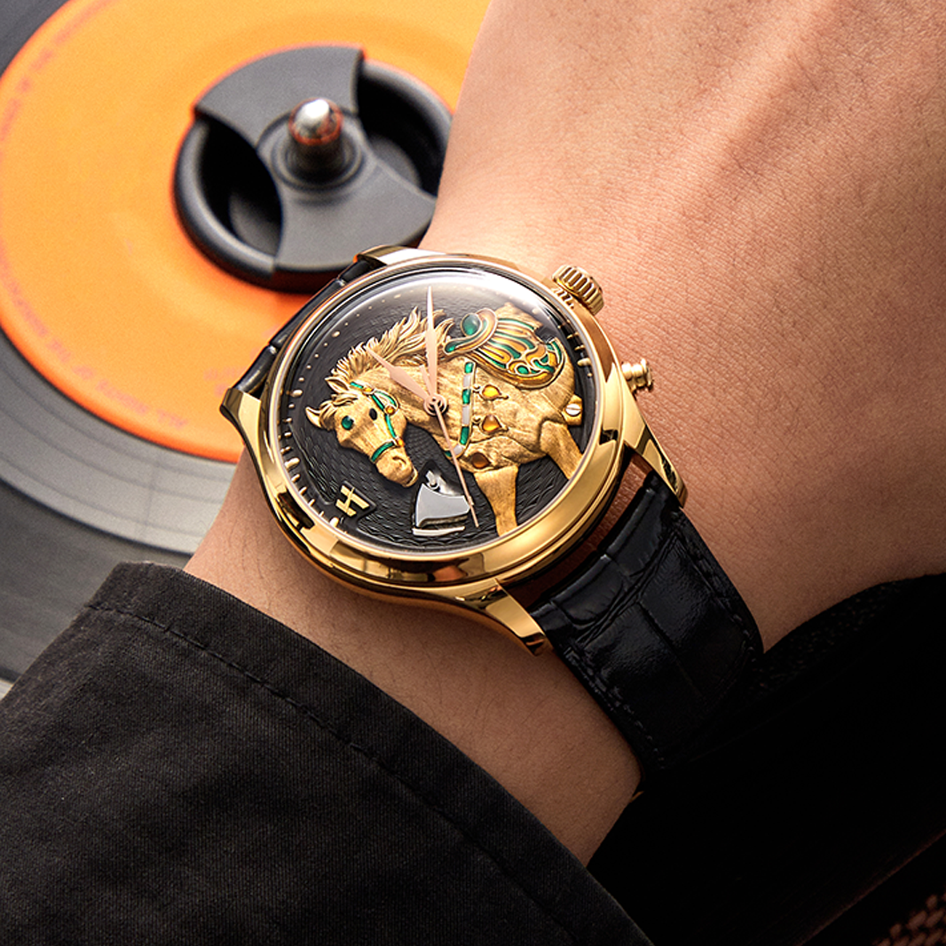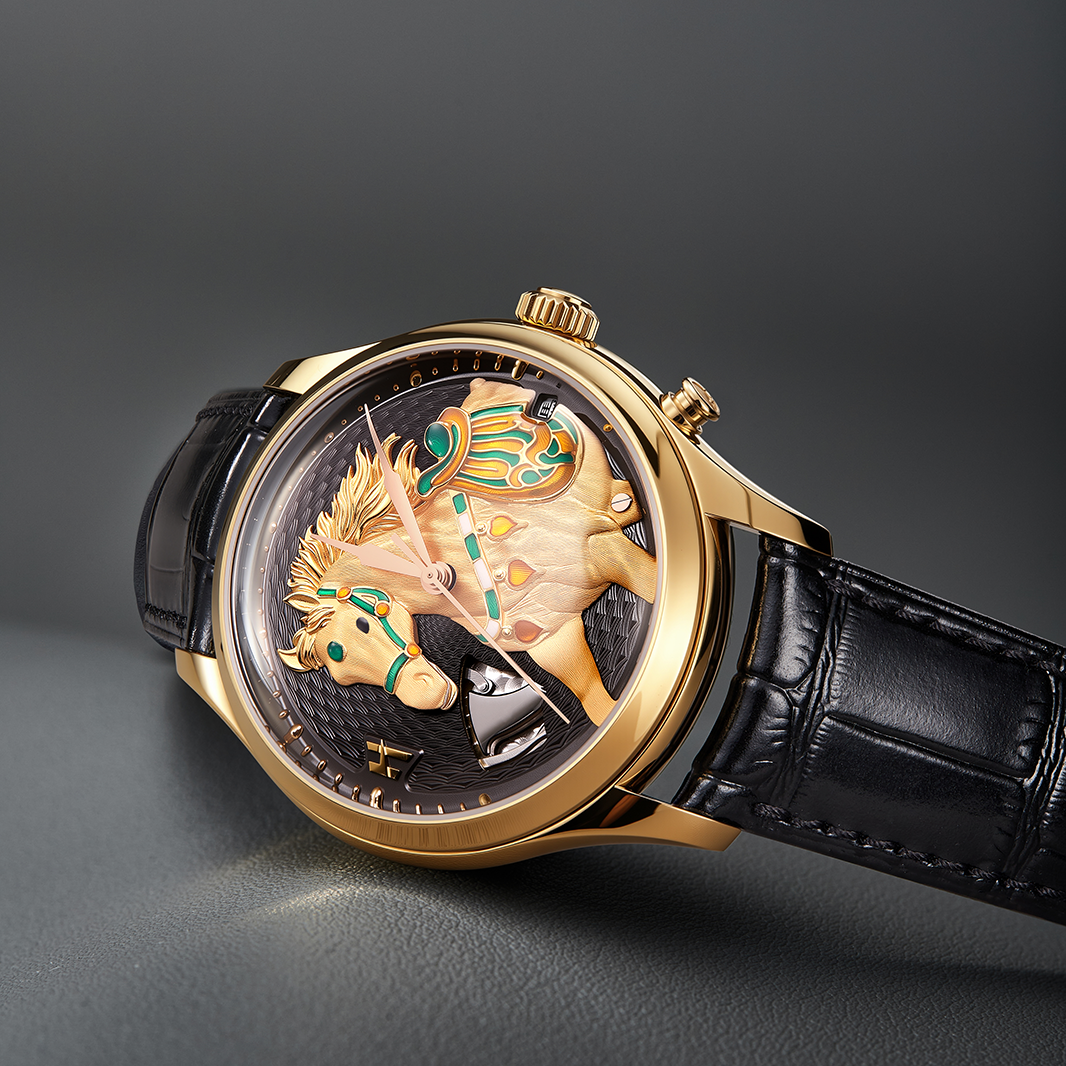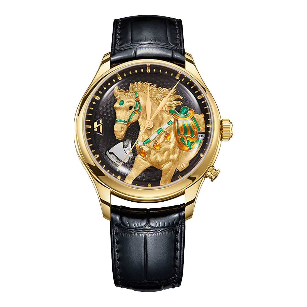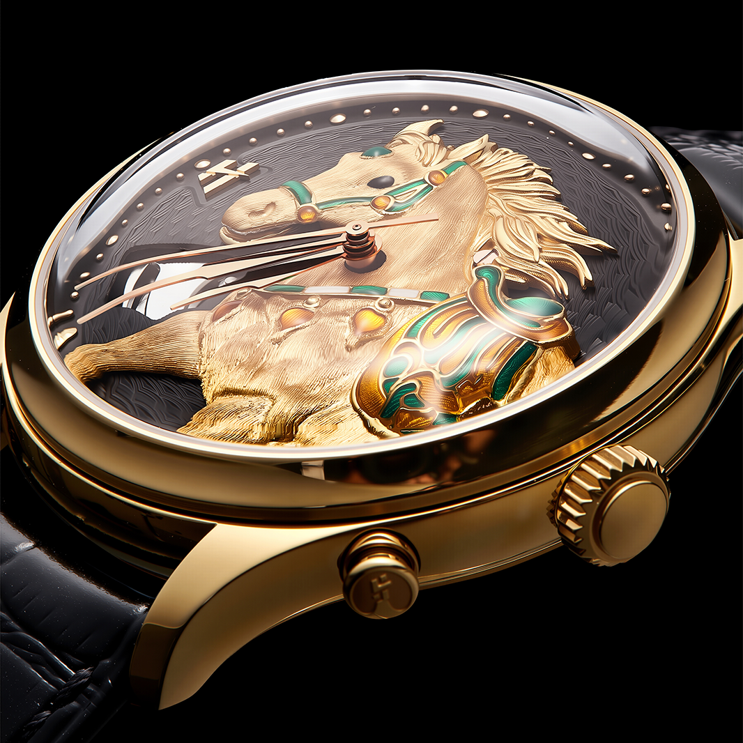 The horse motif is central to the watch’s identity. Its form blends the expressive stance of Tang Sancai ceramic horses with the muscular strength seen in Han Dynasty bronze sculptures, resulting in a steed that feels both majestic and grounded.
