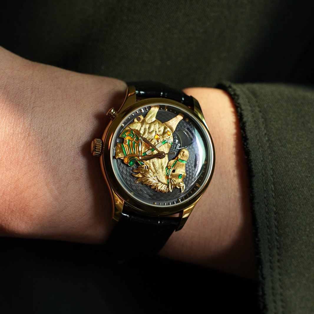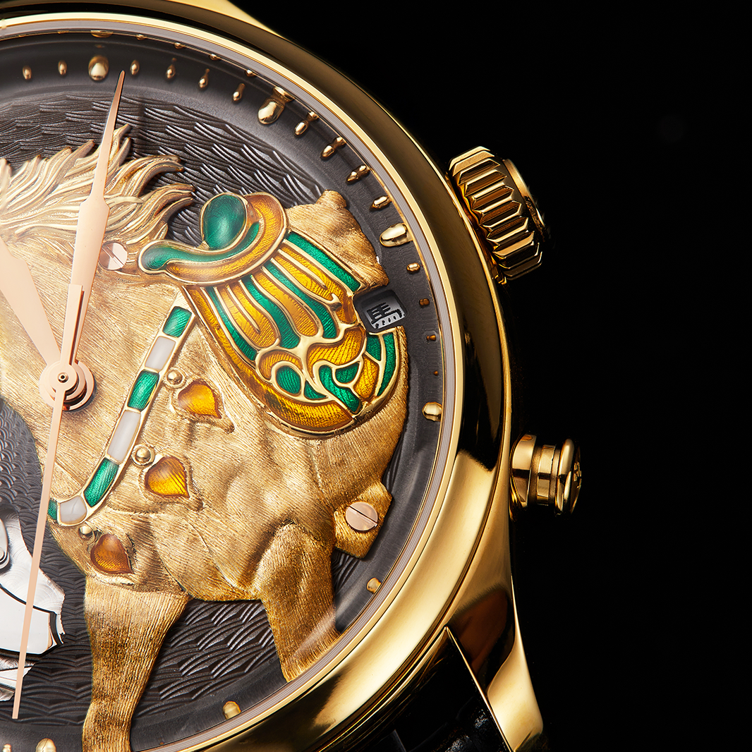 This watch expresses its character through sound, material, and symbolism. The mechanical chiming function marks the passage of time audibly, while the hand-crafted horse figure and layered dial details invite slower appreciation. It is a timepiece designed not only to be worn, but to be contemplated.