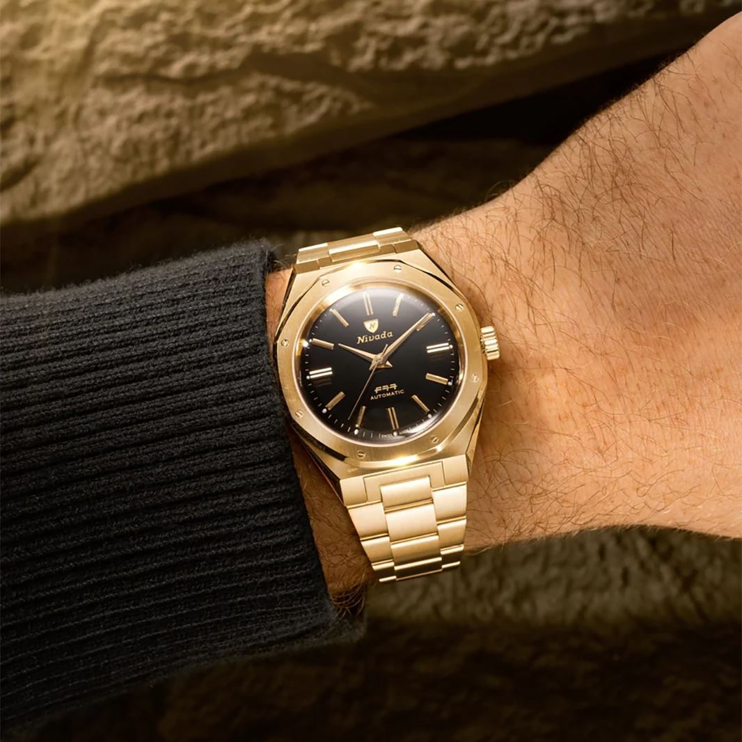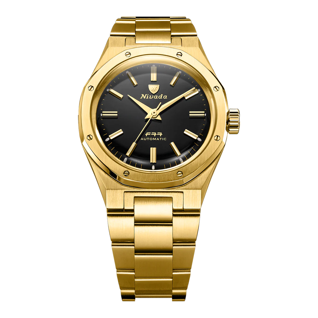 A golden revival of a 1977 icon, the F77 Mark II Gold brings vintage charisma into sharp modern focus. Inspired by the golden era of integrated sports watches, this edition reinterprets Nivada Grenchen’s original F77 with a richer material language and refined proportions - confident, architectural, and unmistakably period-correct.