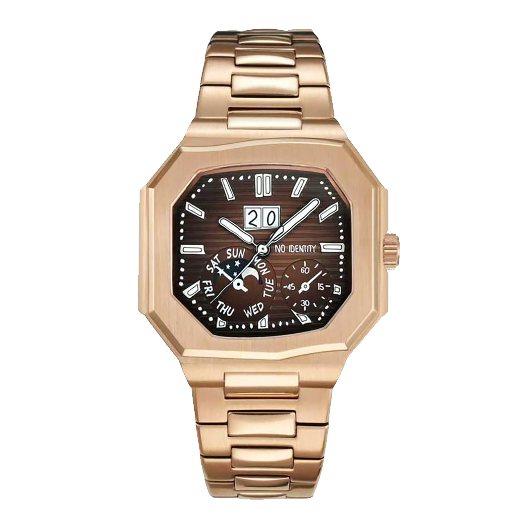The NO IDENTITY Cuboid Rose Gold is a distinctive wristwatch that pairs modern design with refined sophistication. Crafted from stainless steel with a rose-gold tone, this bold timepiece features an asymmetrical case and eye-catching dial that bring new perspective to classic luxury aesthetics.