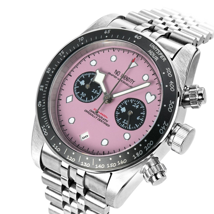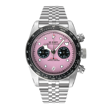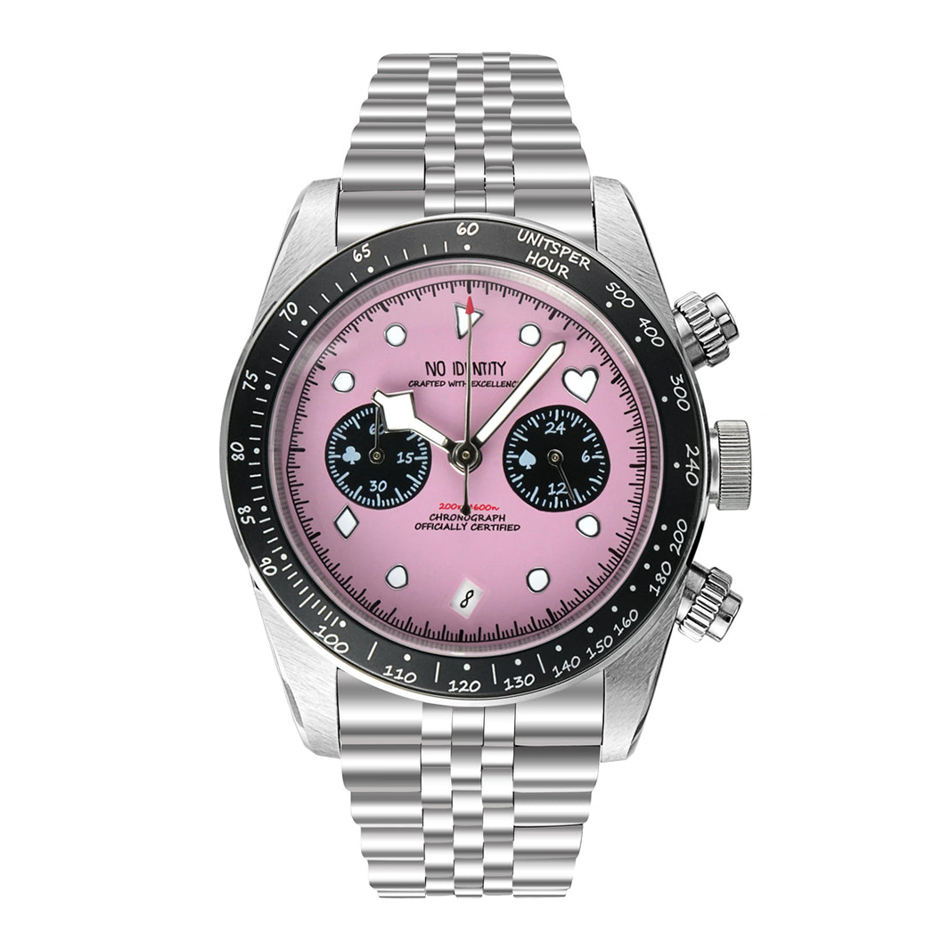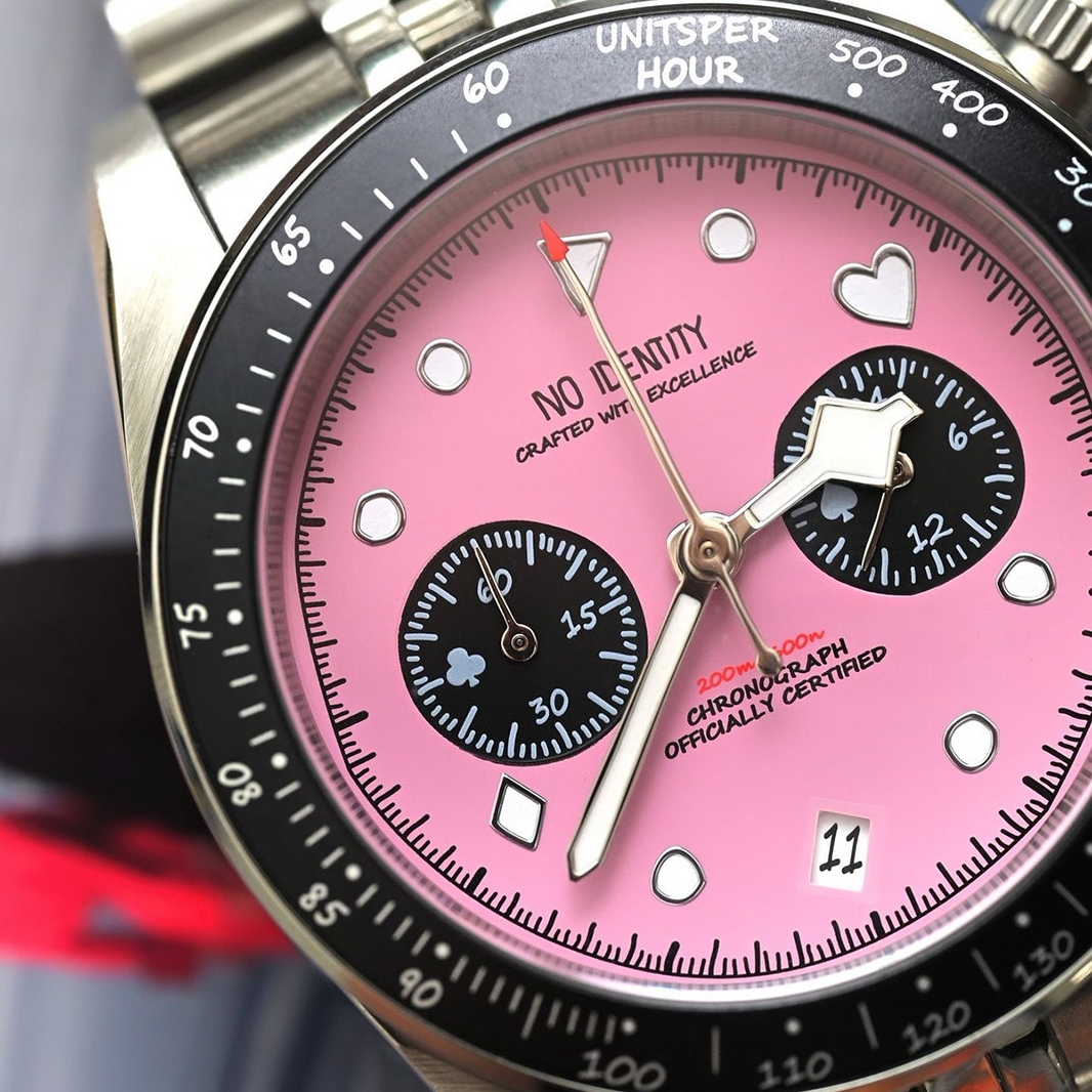NO IDENTITY presents a daring redefinition of timekeeping tradition with this asymmetrical chronograph, inspired by Labeg’s visionary take on the iconic Black Bay Chrono. Fusing classic design cues with whimsical artistry, this timepiece features a captivating dial set within an unconventional asymmetrical case—challenging norms while embracing refined elegance.