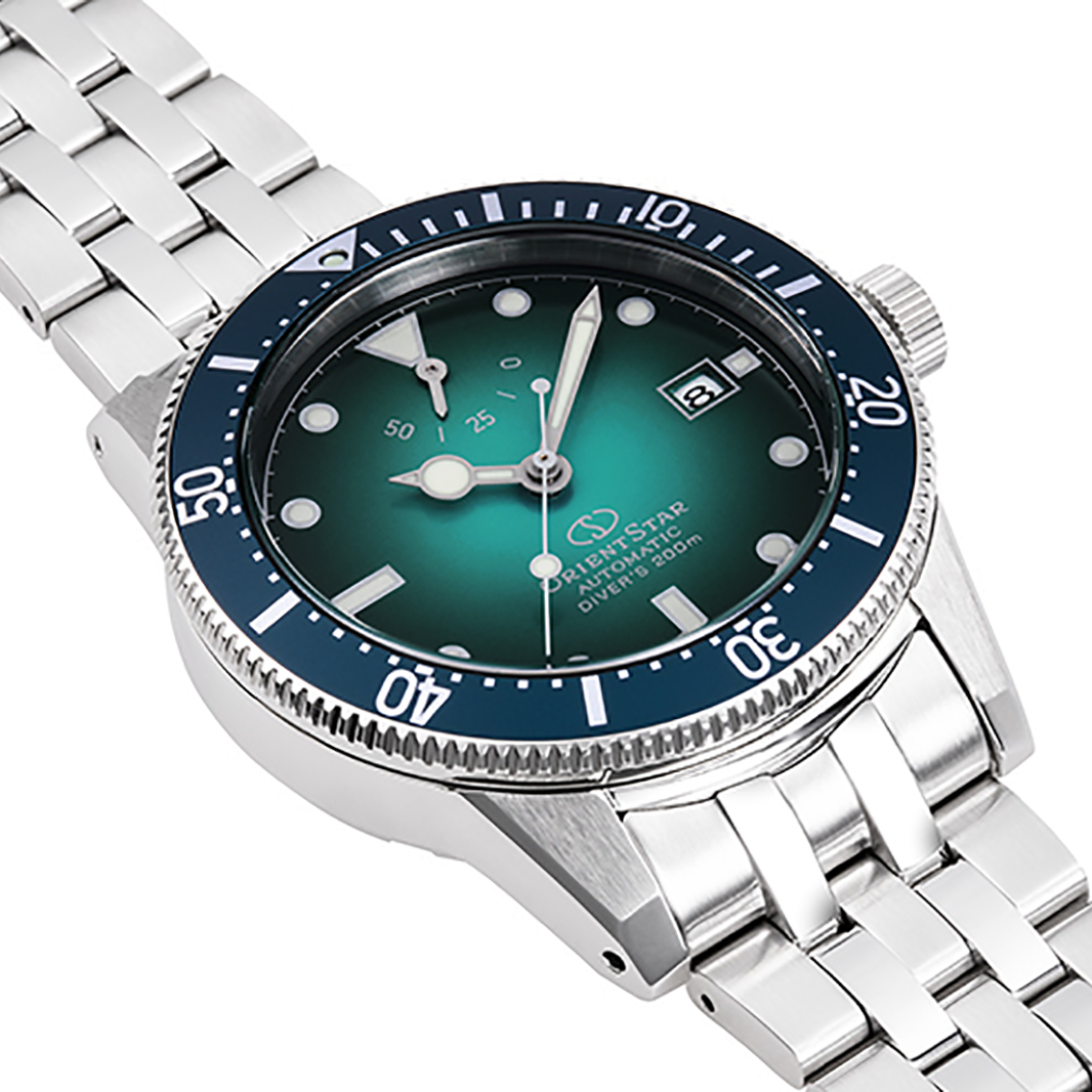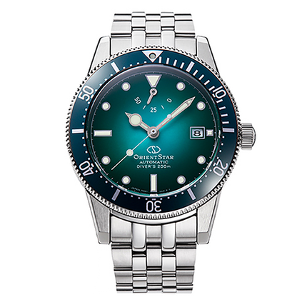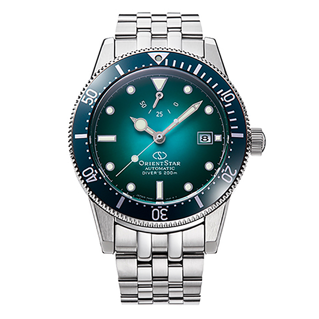 This model reflects the spirit of the divers who dive deep into the underground lakes to survey the cave and unlock its mysteries. The case is made of high-quality stainless steel (SUS316L) and its relatively compact 41mm diameter makes it ideal for everyday use. The five-piece link metal strap is made of the same SUS316L stainless steel, providing an unmistakable presence on the wrist as well as a comfortable fit. A divers’ extension structure and the trifold deployment buckle with push button and security latch are included, making the watch practical to use when playing sports or walking around town. The pyramid-like ridges of the additional silicon strap echo the design of the metal band of the original Calendar Auto Orient, providing a different look to enjoy.