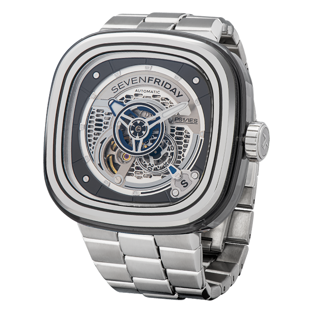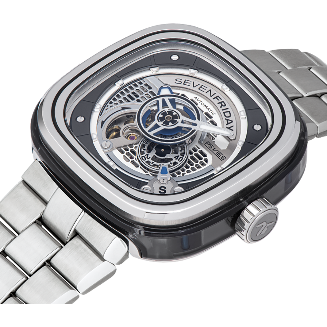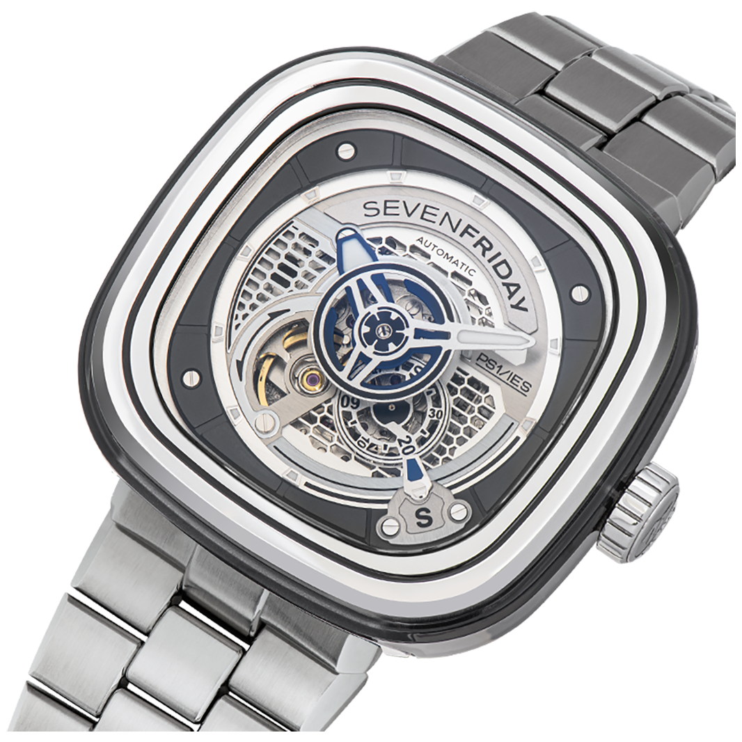The SEVENEFRIDAY PS1/01M is the timeless PS1/01 with a factory fitted metal bracelet. The metal bracelet has been specifically designed in-house, in order to fit perfectly with SEVENFRIDAY's iconic case in terms of style, quality and comfort. The addition of the stainless steel bracelet to the SEVENFRIDAY PS1/01 turns it into a definitive statement piece.