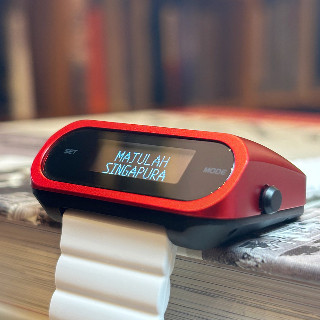 LED digital display with time, date, temperature, alarm, stopwatch, timer, and dual time functions; specially programmed text, “Majulah Singapura” |