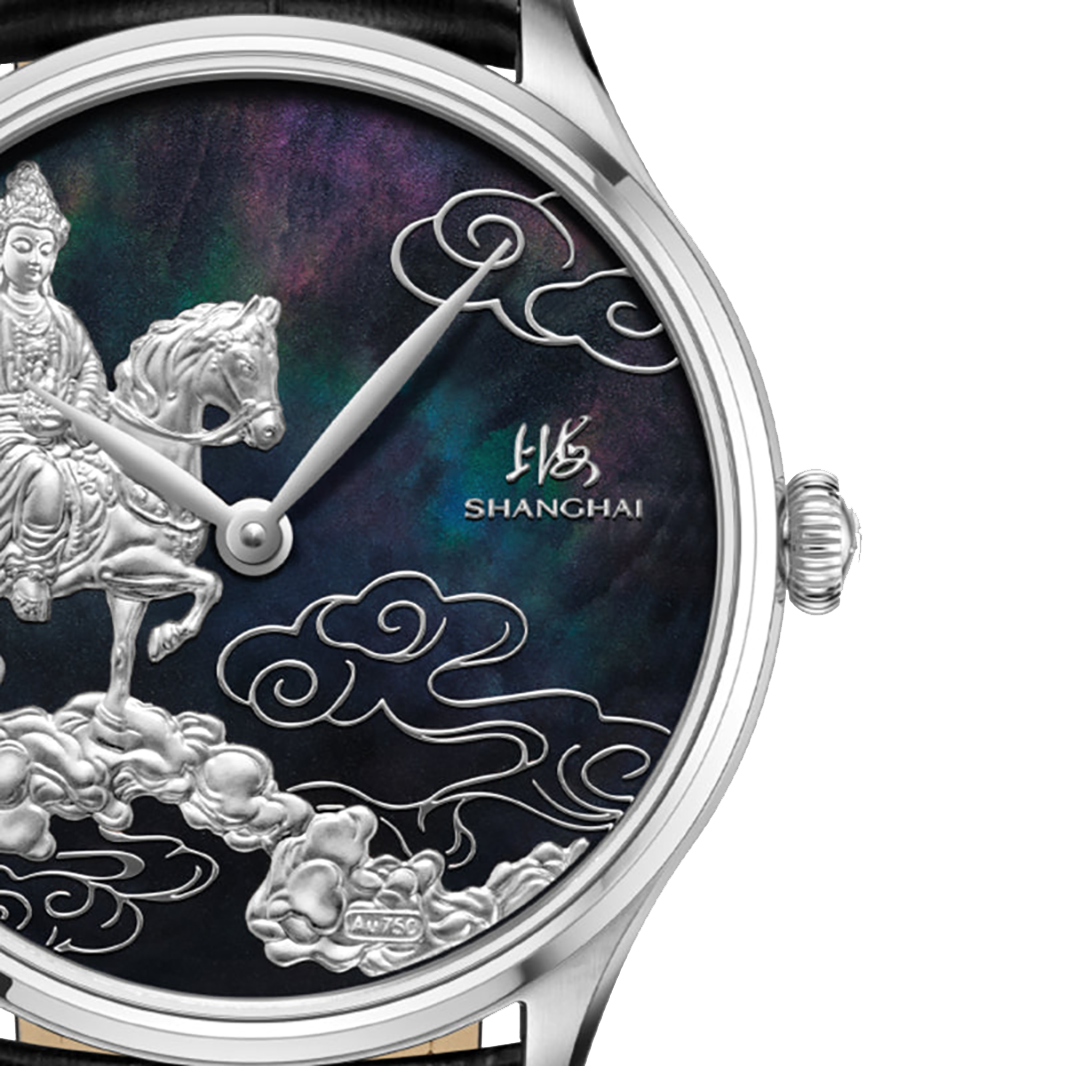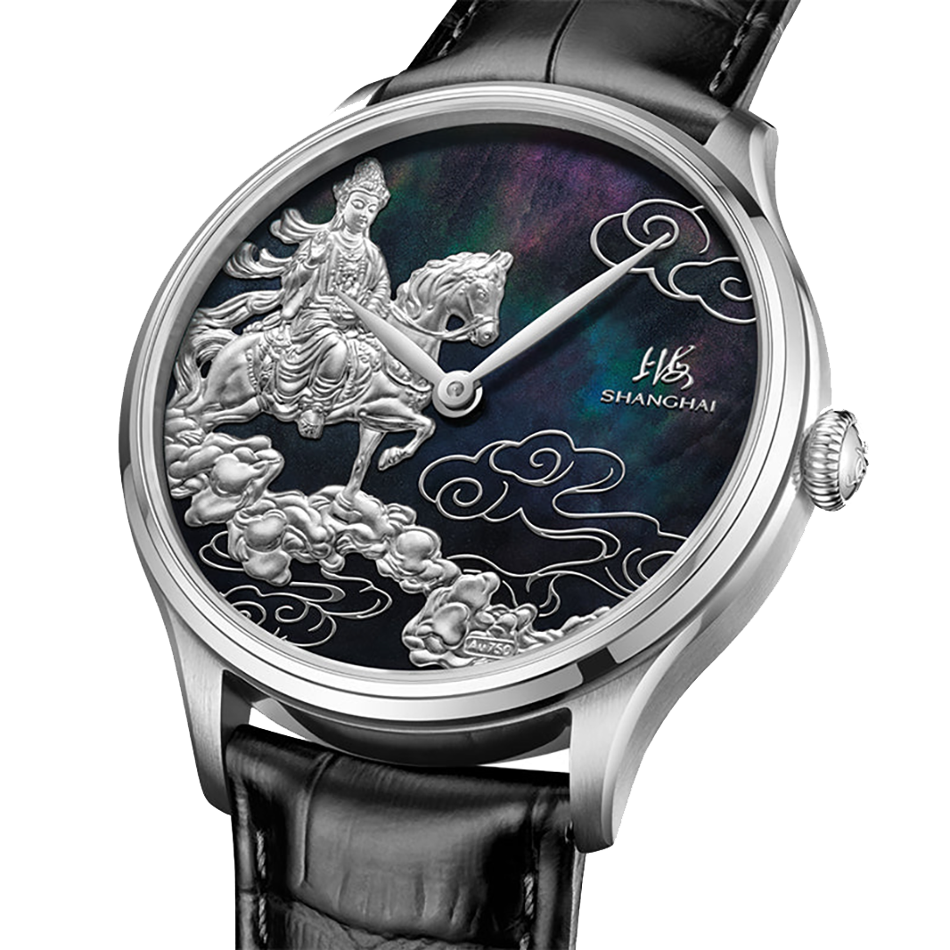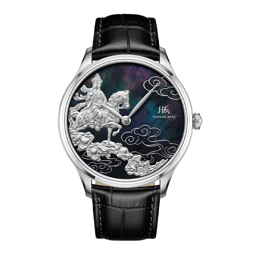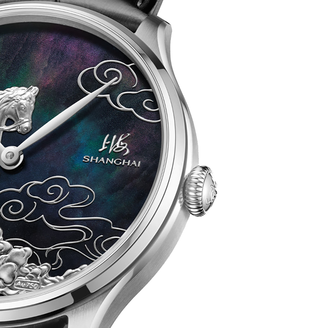 A refined interpretation of strength guided by wisdom, the Shanghai Auspicious Steeds 40mm Mother-of-Pearl edition expresses ambition through clarity and intention. Limited to 999 pieces worldwide, it pairs sculptural 18K white gold engraving with a deep black mother-of-pearl dial that shifts subtly under light.