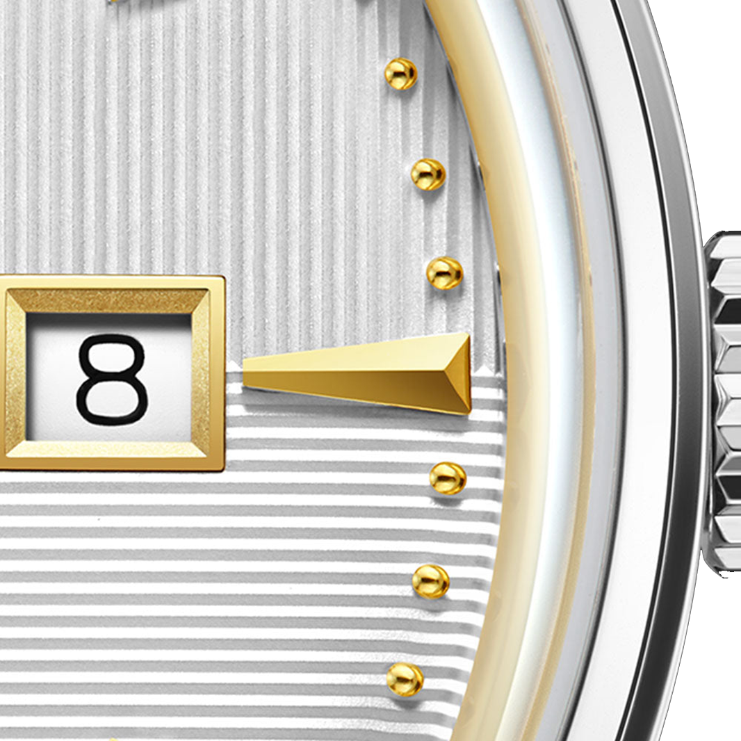The quad-patterned dial, defined by a harmonious interplay of horizontal and vertical lines, adds depth and texture while maintaining clarity and balance. Finished in elegant white with gold-toned accents, the dial exudes understated sophistication and urban refinement. A discreet date window integrates seamlessly into the layout, offering everyday practicality without disrupting the vintage aesthetic.