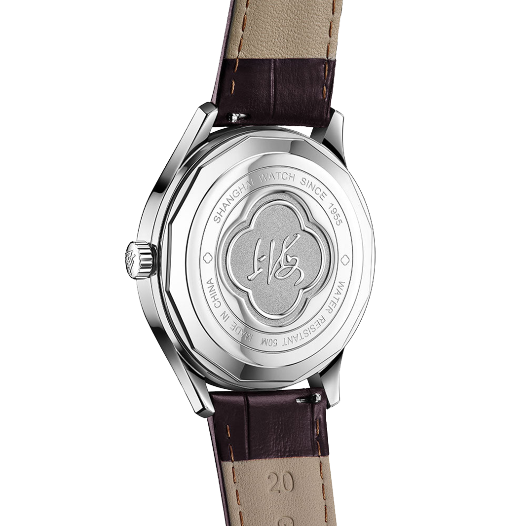 Turning the watch over reveals a finely crafted stainless-steel case back, decorated with a retro double-ring floral motif and elegantly engraved with “Shanghai” in calligraphy; a subtle yet meaningful tribute to the city’s cultural depth and sophistication.