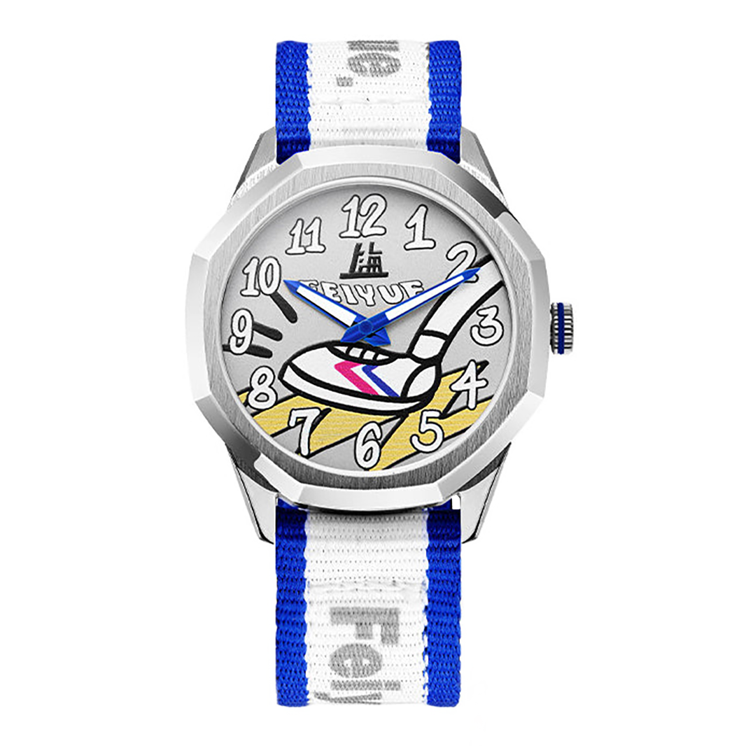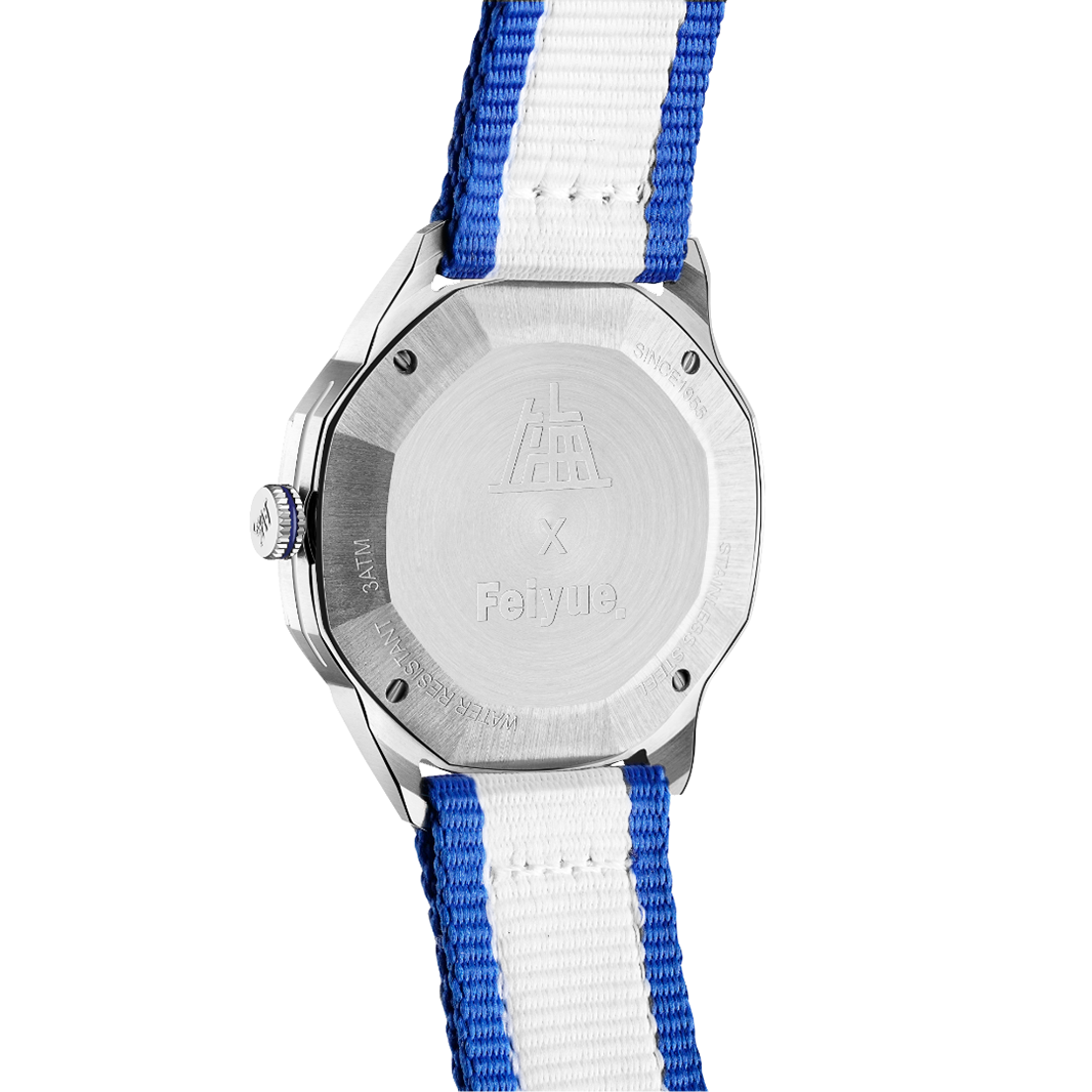 Paired with a white-and-blue nylon strap, the watch carries a sporty, relaxed character that echoes Feiyue’s iconic colour language. Lightweight, breathable, and comfortable, the strap ensures ease of wear across long days and casual settings.