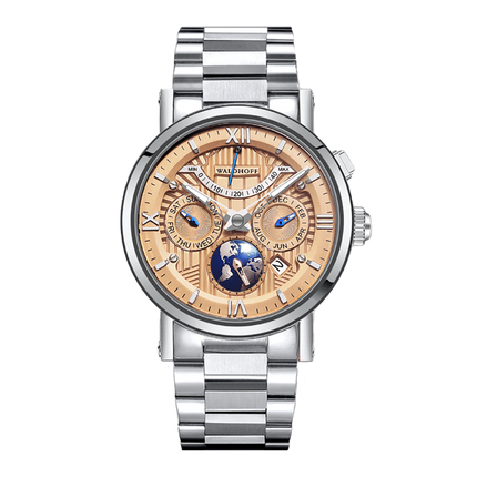 Art Deco style metallic dial formed by hydraulic compression; metallic 3D world map at 6 o'clock position; diamond-cut hands with lume
