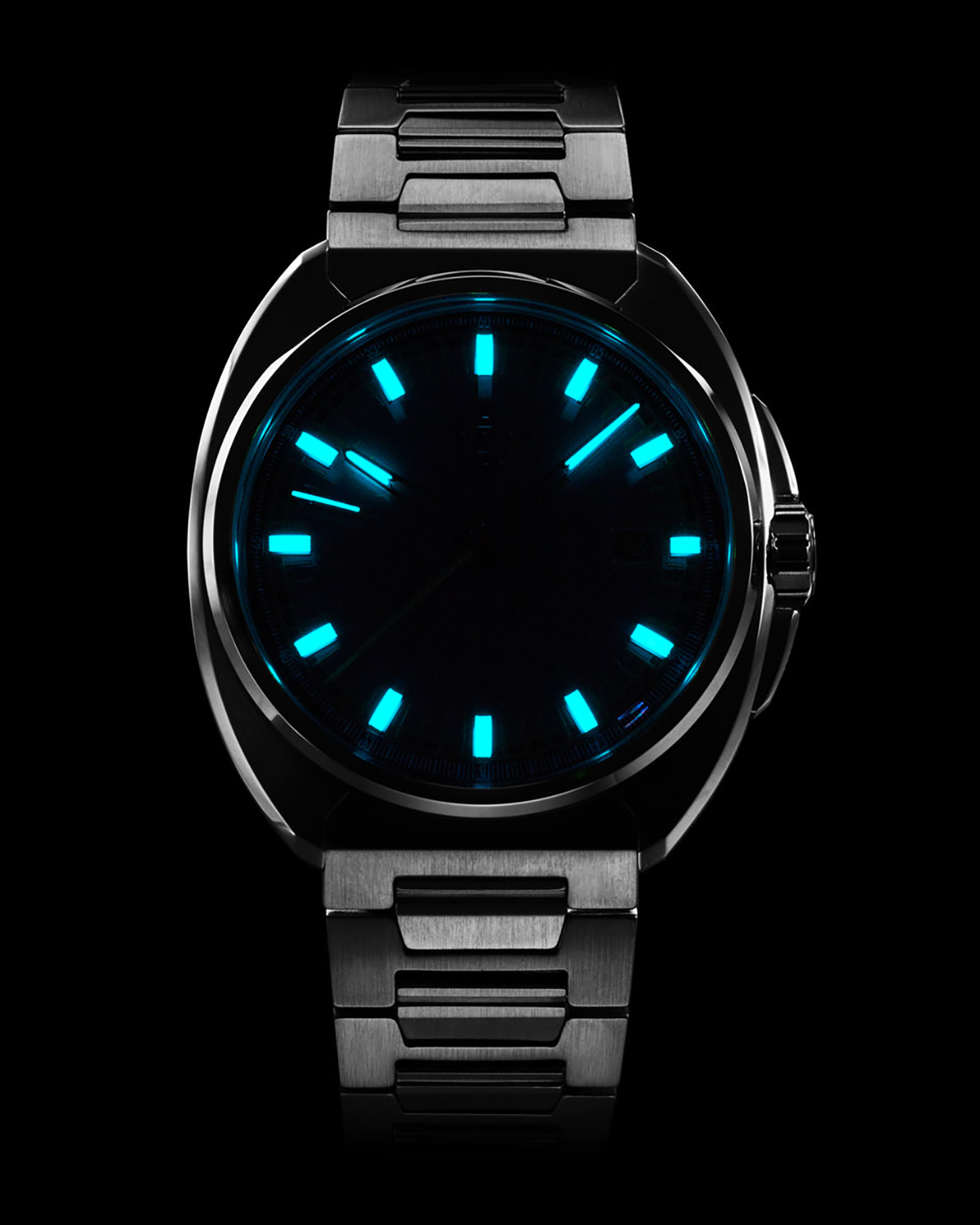 The stainless steel case features a mix of brushed and polished surfaces, highlighting the watch’s sculpted form.